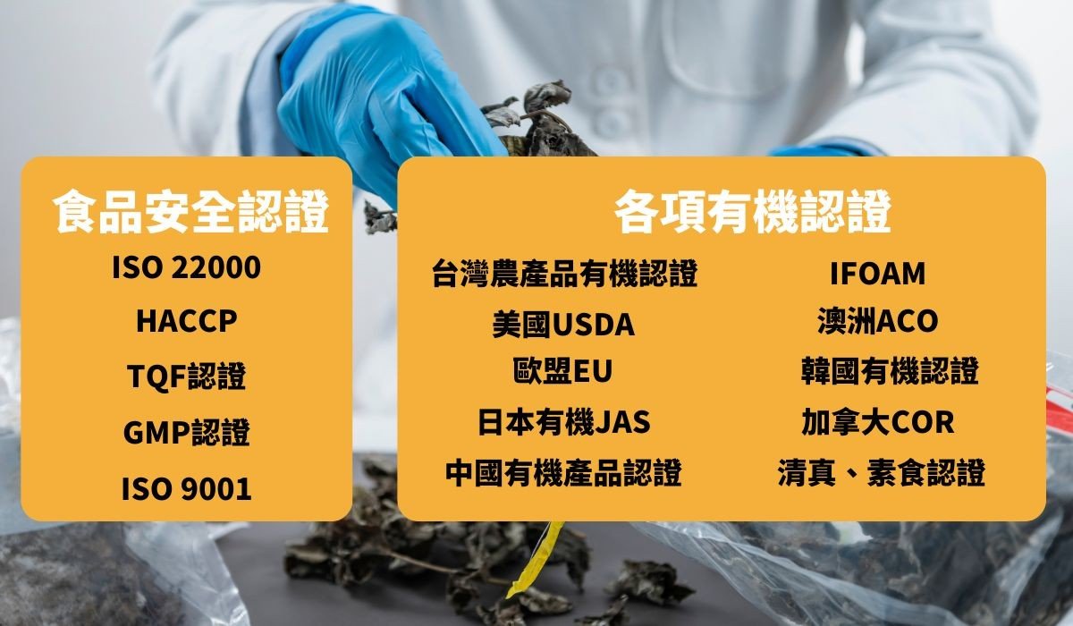取得相關的認證不僅能讓產品提高市場競爭力,還能增強消費者的信任感,在食品和中藥品領域中常見的國際標準,取得這些認證可展示品牌對食品安全的承諾,茶包也能藉此順利進入不同市場。