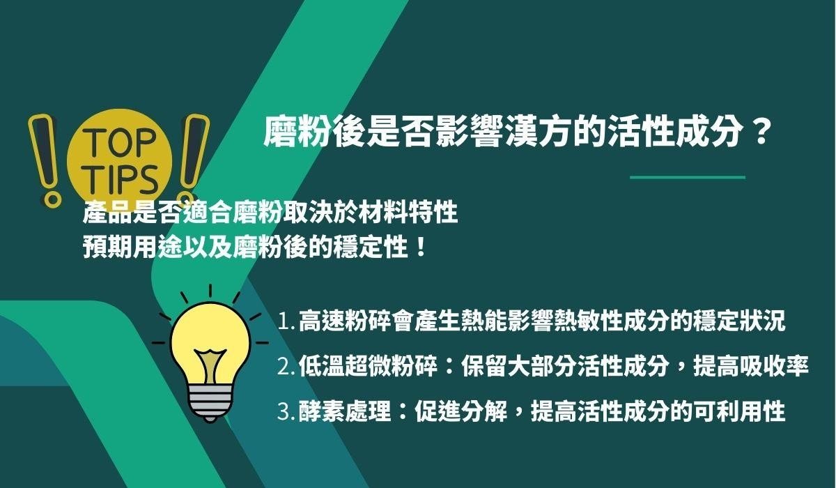 產品是否適合磨粉取決於材料的特性、預期用途以及磨粉後的穩定性,在選擇磨粉代工的原料時,最好考慮其活性成分的保護與產品的最終應用,選擇合適的加工技術,因為高溫研磨是可能導致部分漢方成分揮發流失。