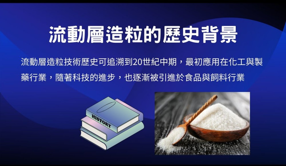 流動層造粒技術歷史可追溯到20世紀中期,最初應用在化工與製藥行業,隨著科技的進步,也逐漸被引進於食品與飼料行業。流動層造粒技術的發展促進顆粒產品的生產效率,還提高產品質量與一致性,隨著市場需求的變化與演進,還溶入的自動化與智能化,提高生產的靈活性與效率!