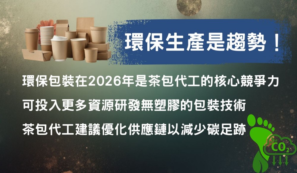從茶葉種植到包裝運輸,茶包代工建議優化供應鏈以減少碳足跡;使用再生能源、過少過度包裝、採用綠色物流方案都是2026的茶包代工趨勢。