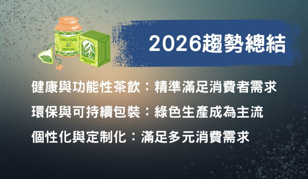 2026年的茶包代工將結合健康、環保與個性化三大重點趨勢。代工廠需緊跟市場趨勢,提升研發能力、環保技術與生產效率,以應對未來的挑戰與機遇;擁抱趨勢,茶包代工將迎來更廣闊的發展前景,並為消費者帶來更高品質的茶飲體驗。