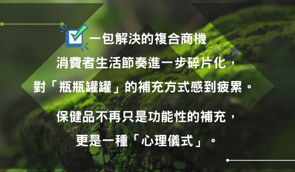 (1) 趨勢洞察: 消費者偏好「一包搞定」的隨身包。井元生技專注於精準配方平衡術,解決不同原料間的拮抗作用。