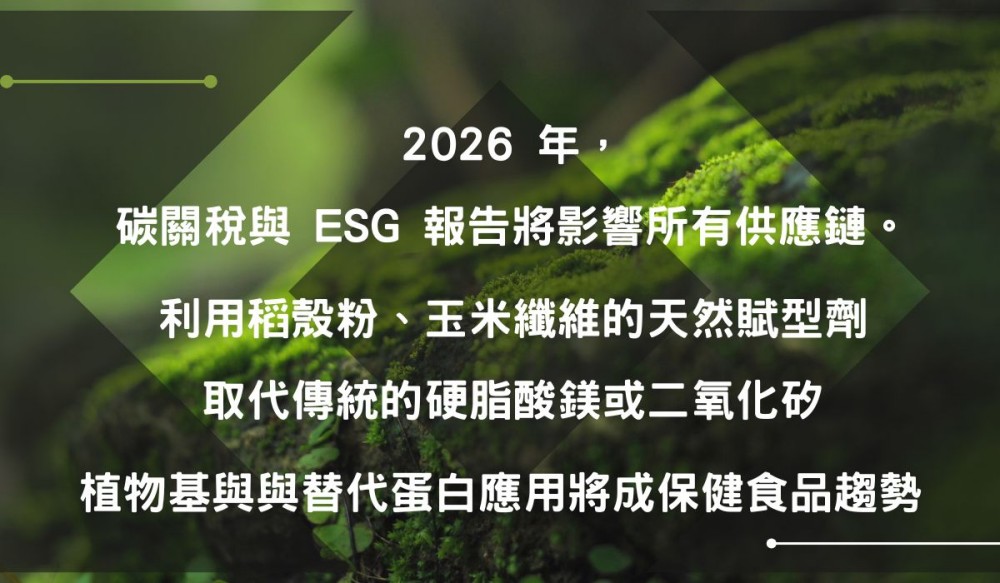 植物基與與替代蛋白應用將成2026保健食品趨勢,例如新奇的昆蟲蛋白、微藻DHA是可取代傳統魚油的,也符合歐盟ESG規範,包裝改用可食用薄膜(如海藻膠囊)或可堆肥材料,另外「綠電生產線」與「碳權抵換」也成為國際品牌的採購門檻。