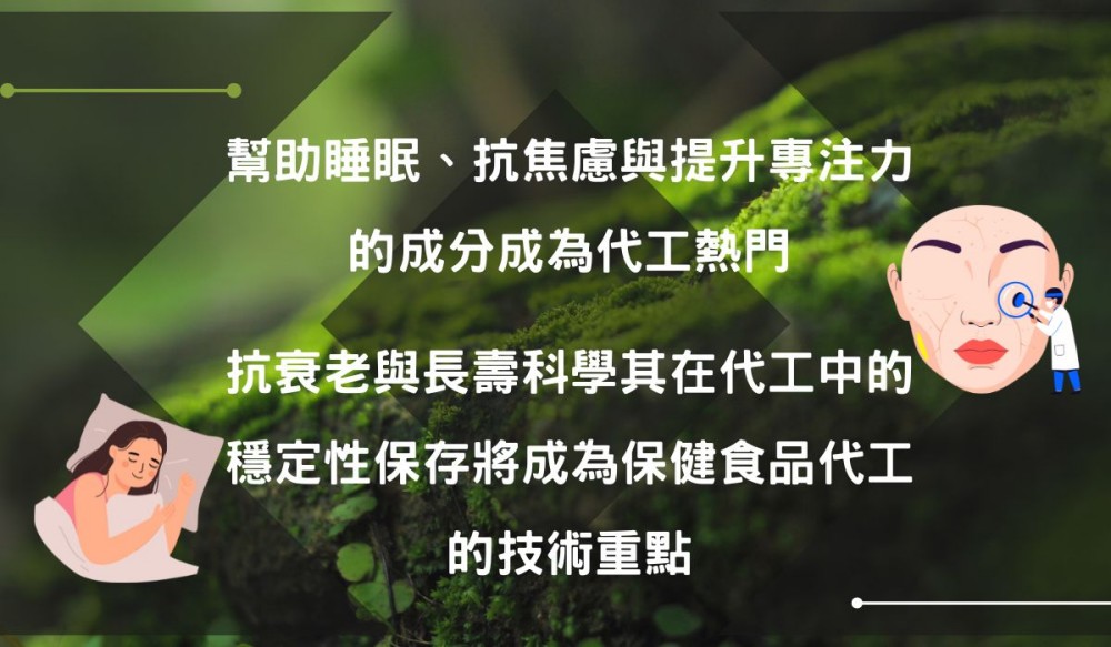 隨著全球壓力指數上升,幫助睡眠、抗焦慮與提升專注力的成分成為代工熱門。後生元(Postbiotics)比益生菌更穩定、更耐高溫,適合加入各種劑型中;適應原(Adaptogens)如南非醉茄、靈芝等具備抗壓的原料需求大增。