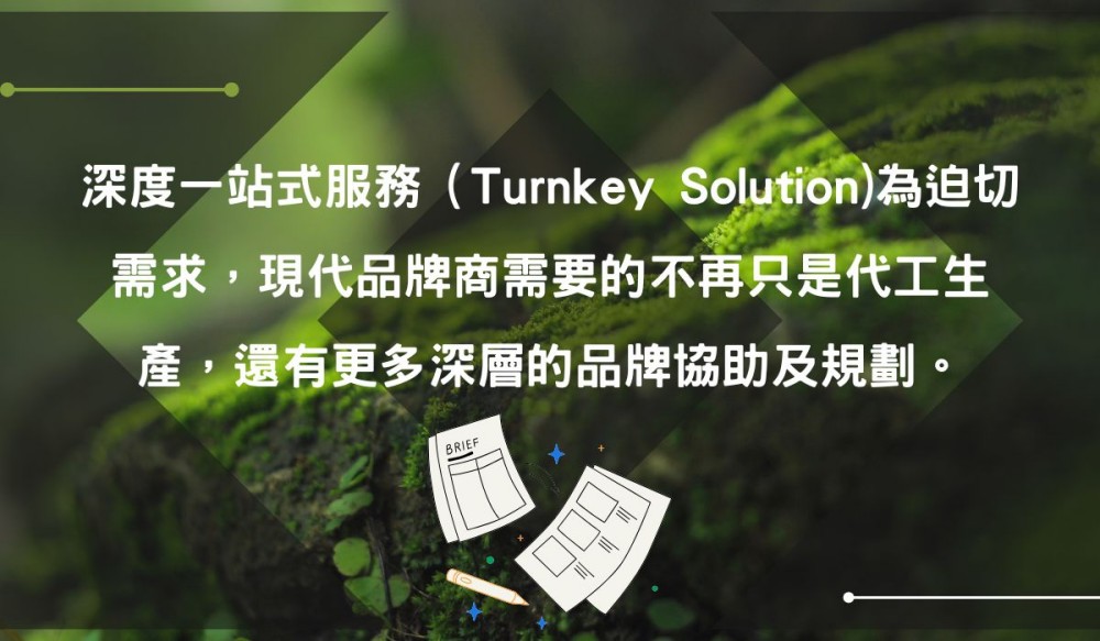 深度一站式服務(Turnkey Solution)為迫切需求,現代品牌商需要的不再只是代工生產,還有更多深層的品牌協助及規劃。