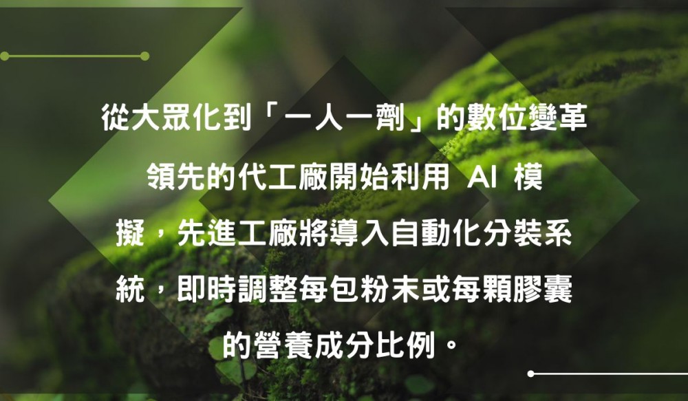 (2).個人化訂製產線: 傳統大宗生產模式正向「微型化」轉變。先進工廠將導入自動化分裝系統,能根據消費者的基因(DNA)或腸道菌叢(Microbiome)報告,即時調整每包粉末或每顆膠囊的營養成分比例。