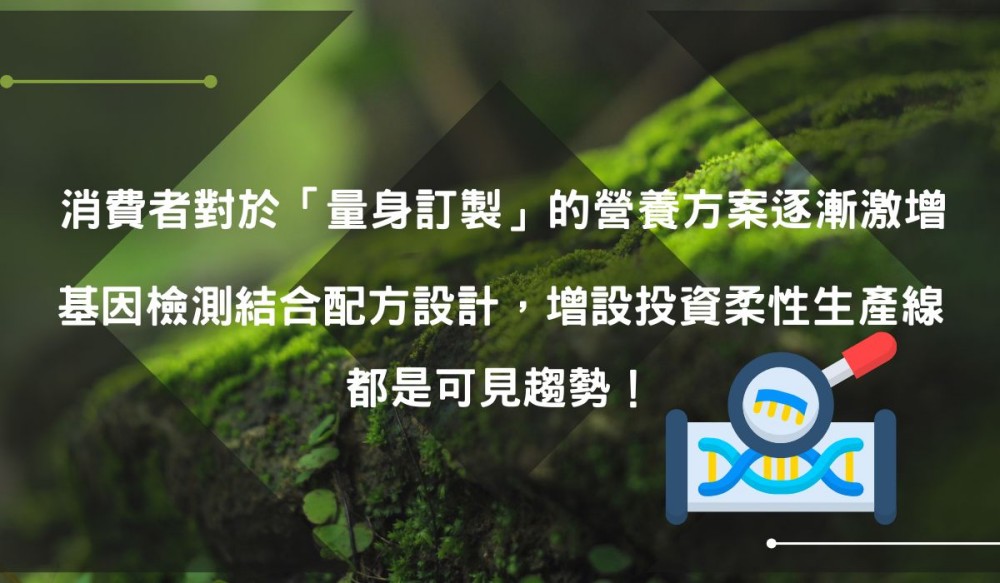 隨著基因檢測與各項穿戴式裝置普及化,消費者對於「量身訂製」的營養方案會逐漸激增,根據Nutrition Business Journal預測,2026年個人化營養市場將佔全球保健食品總額的15%;建議代工廠平台可把基因檢測結合配方設計,並依消費者身體需求3D列印複方營養素,增設投資柔性生產線都是可見趨勢!